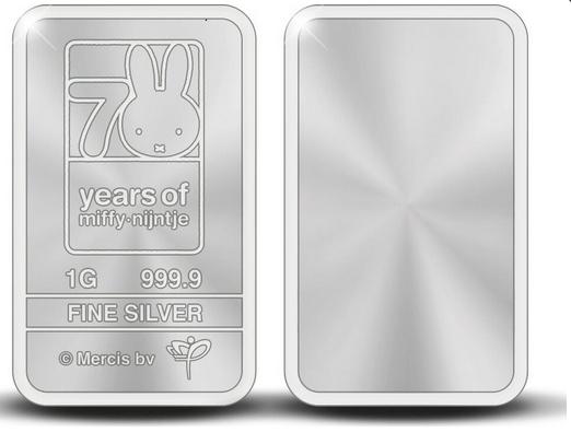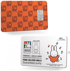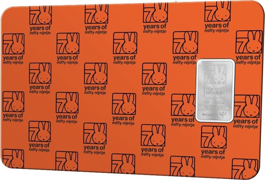 Barra de 1 gramo de plata de la más alta calidad conmemorativa de los 70 años de Miffy en cartulina fina. La barra de plata más singular que jamás hayas visto. Edición exclusiva de la Royal Dutch Mint: un lingote de plata conmemorativo de los 70 años de Miffy