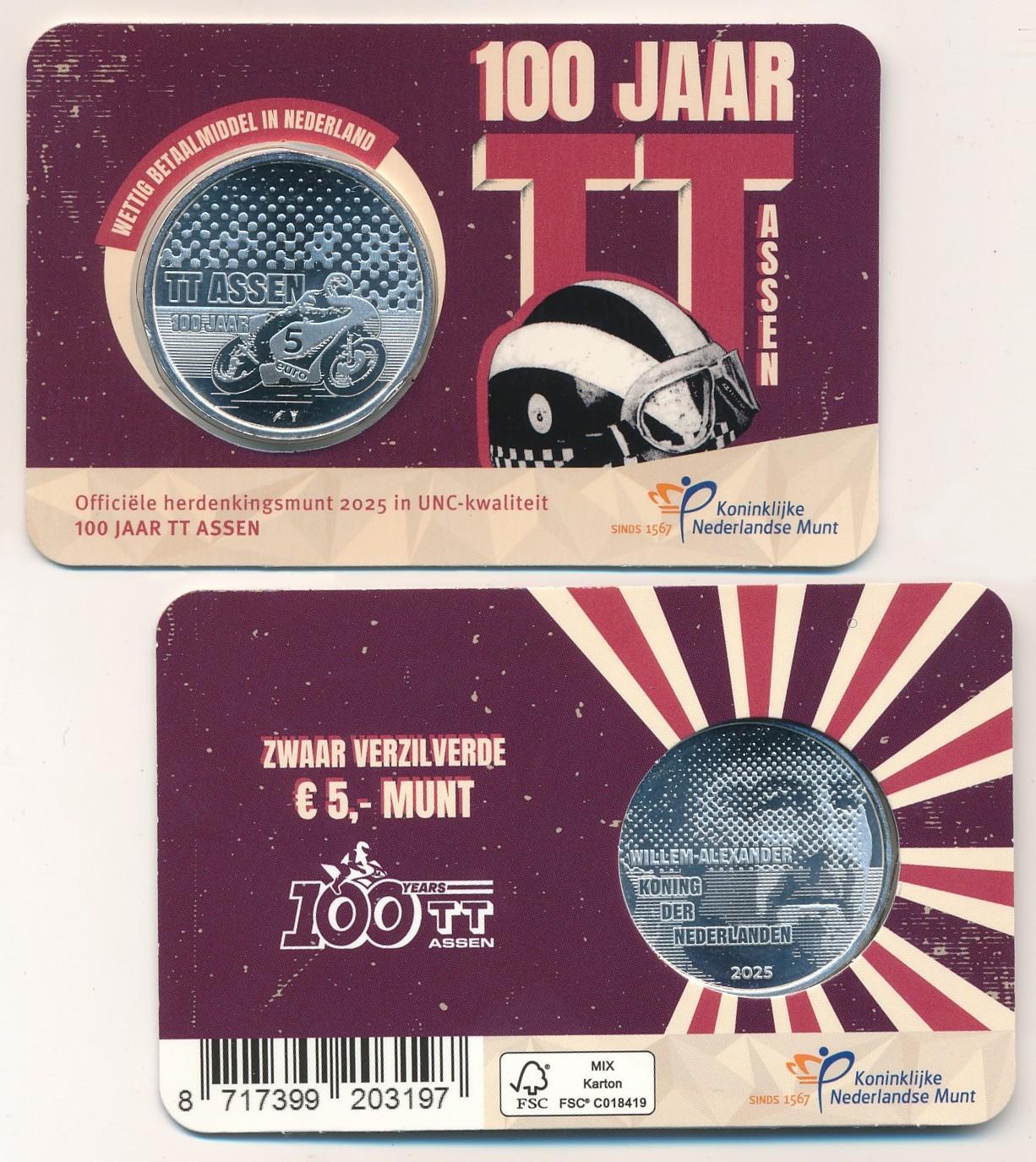 Coincard de Holanda con los 5 Euro 2025 dedicados al 100 aniversario de las carreras de motor en Assen, en calidad S/C.