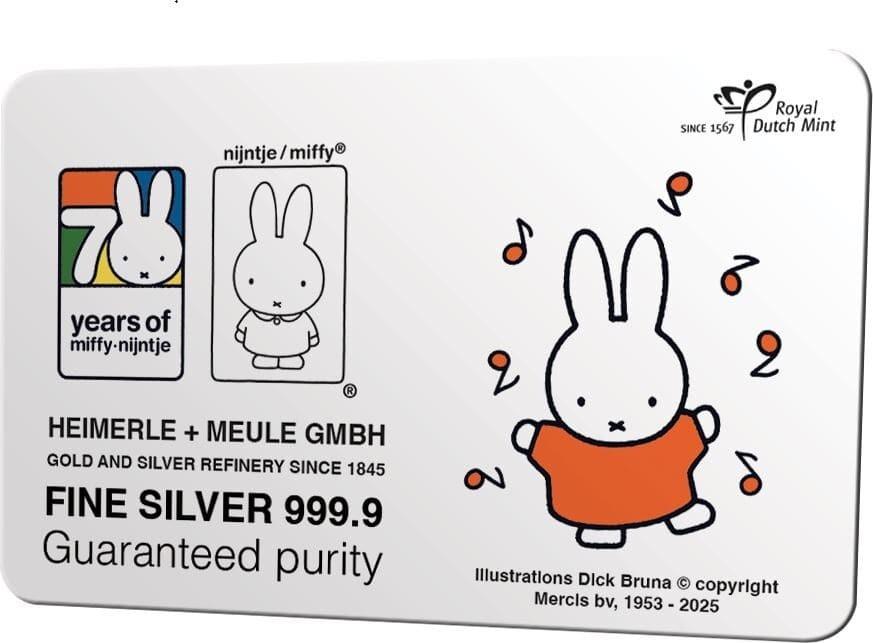 Una edición única para el 70.º cumpleaños de Miffy. Especialmente para el aniversario del conejito favorito de los Países Bajos, la Real Casa de la Moneda de los Países Bajos emite un lingote de plata de 1 gramo. Sin duda, es el lingote de plata más singular que jamás hayas visto: ¡imprescindible!