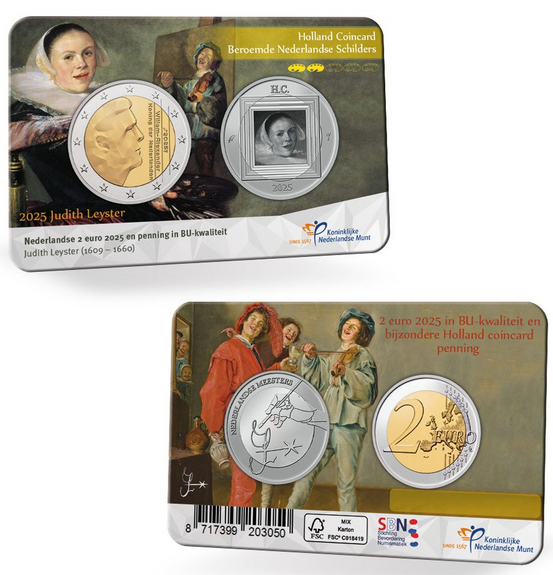 Coincard oficial de los Países Bajos con los 2 Euro 2025 en calidad BU dedicada a la pintora Judith Leyster.