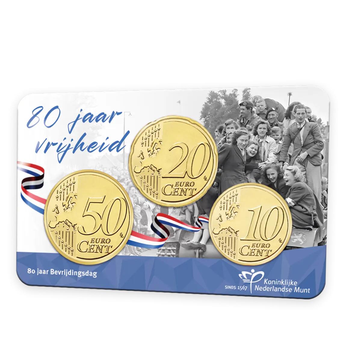 Coincard oficial de los Países Bajos con las monedas de 10, 20 y 50 Euro Cent del 2025 dedicada al Día de la Liberación, en calidad BU.