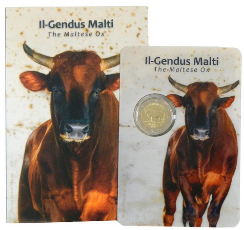 Coincard con la moneda de 2 Euro Malta 2025 de la serie Ciudades amuralladas de Malta, dedicada al buey maltés, en calidad BU.
