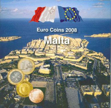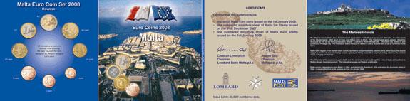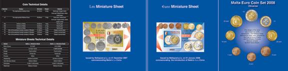 Cartera oficial de Malta con los 8 valores Euro (0.01 -2 €) en calidad BU emitida por el Servicio Postal con motivo de la introducción del Euro en 2008. La cartera incorpora Dos hojas en miniatura numeradas cada una con un sello. Uno de fecha 31/12/2007 dedicado a la lira maltesa y otro 01/01/2008 al euro