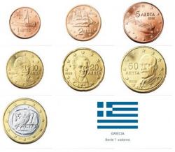 Serie con las Monedas de Grecia emitidas para circulación en 2014, 1, 2 y 5 Euro Cent procedente de cartuchos en calidad SC.