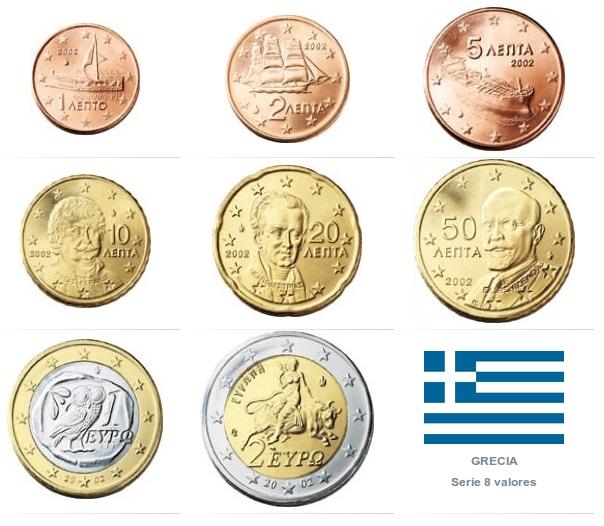 Serie de Grecia con los 8 valores Euro (0.01 € - 2 €) del 2005, sacadas de cartucho en calidad SC.