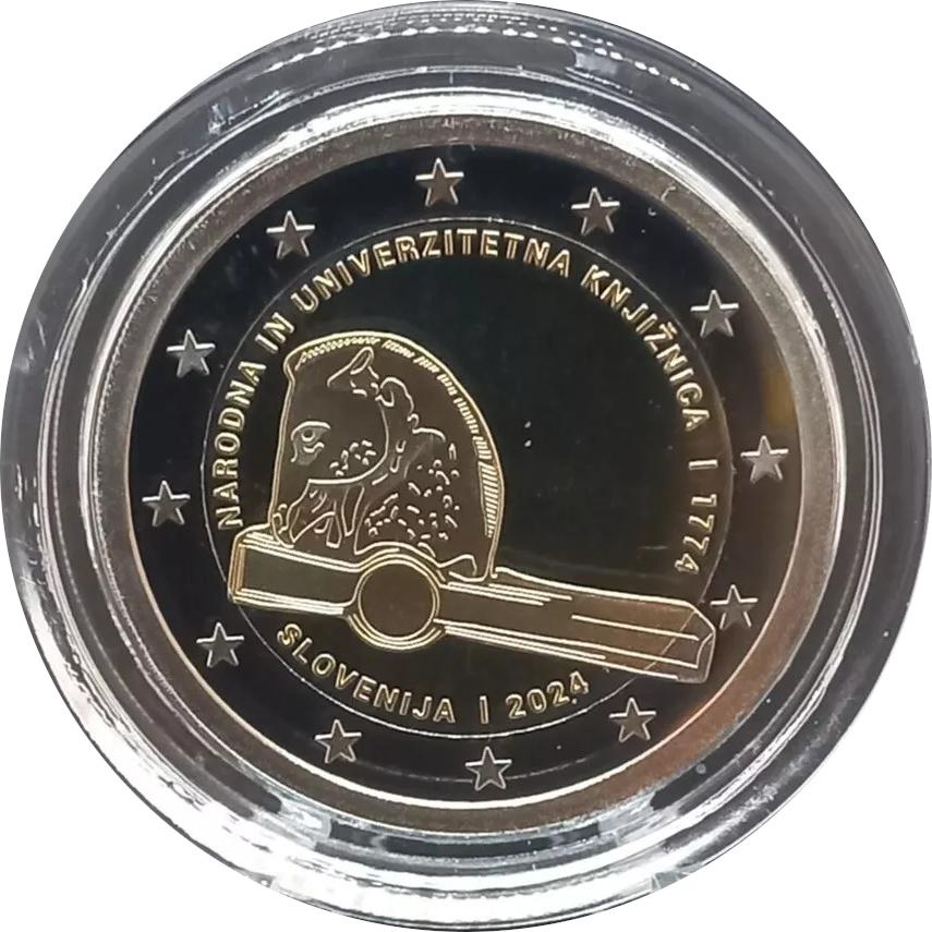 Cápsula con la moneda de 2 Euro Eslovenia 2024 conmemorativa del 250.º Aniversario de la Biblioteca Nacional y Universitaria de Eslovenia, en calidad PROOF.