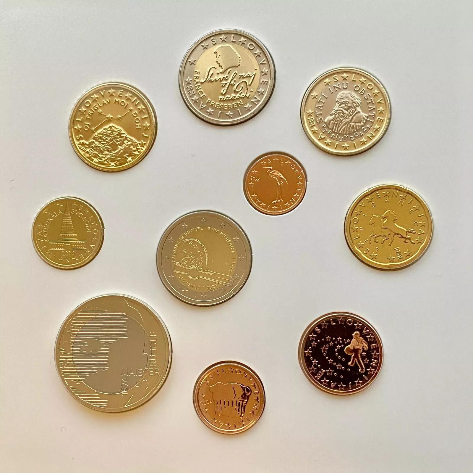 Cartera de Eslovenia en calidad BU con los 10 Valores Euro (0.01 - 2 € comunes), 2 Euro Eslovenia 2024 conmemorativa del 250.º Aniversario de la Biblioteca Nacional y Universitaria de Eslovenia y la moneda local circulante de 3 Euro dedicada a Rudolf Maister, en calidad PROOF.