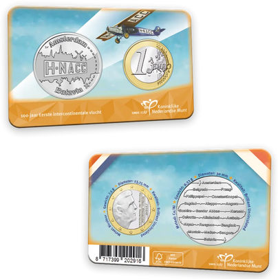 Coincard emitida por los Países Bajos con la moneda de 1 Euro 2024 dedicada a los 100 años Primer Vuelo Amsterdam-Batavia. En calidad BU..