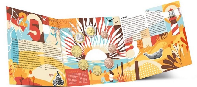 Cartera oficial anual de los Países Bajos con las 8 Monedas Euro (0.01 - 2 €) acuñadas en 2025 perteneciente a la serie "Los cuatro elementos" dedicada al fuego, en calidad BU.