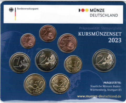 Cartera oficial de Alemania 2023 con las 8 monedas Euro (0.01 - 2 €) comunes + los 2 Euro Filarmónica, acuñadas en Stuttgart F en calidad BU.