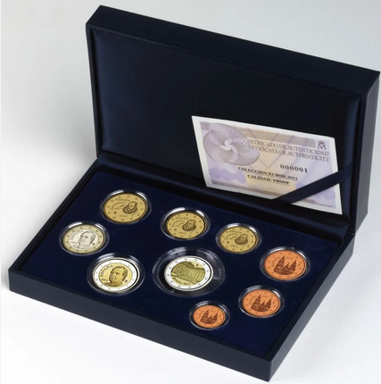 Box oficial de España con las 9 monedas Euro (0.01 - 2 €) y los 2 Euro Alhambra en calidad PROOF.