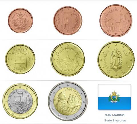 Serie de San Marino con los 8 valores Euro del diseño antiguo de años mezclados (2017-Hoy) procedentes de cartucho y cartera oficial.