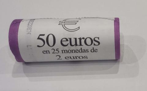 Cartucho con 25 monedas de 2 Euro España 2019 perteneciente a la Serie patrimonio de la Humanidad y dedicada al «Casco antiguo de Ávila e iglesias extramuros», en la que representa «La Muralla de Ávila».