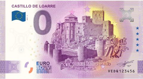 Billete Souvenir 0 Euro dedicado al Castillo de Loarre, edición 2021-1. Fabricado en papel moneda y con las siguientes características de seguridad : marcas de agua, tiras de cobre, impresión en relieve (sensible al tacto), holograma, registro transparente, fondo de seguridad de la imprenta, tinta fluorescente visible bajo luz ultravioleta y un número de serie individual, único para cada billete y diferente al de la ilustración.