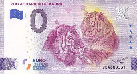 Billete Souvenir 0 Euro de la serie Zoo Aquarium de Madrid dedicado a los Tigres Siberianos, edición 2024-7. Fabricado en papel moneda y con las siguientes características de seguridad : marcas de agua, tiras de cobre, impresión en relieve (sensible al tacto), holograma, registro transparente, fondo de seguridad de la imprenta, tinta fluorescente visible bajo luz ultravioleta y un número de serie individual, único para cada billete y diferente al de la ilustración.