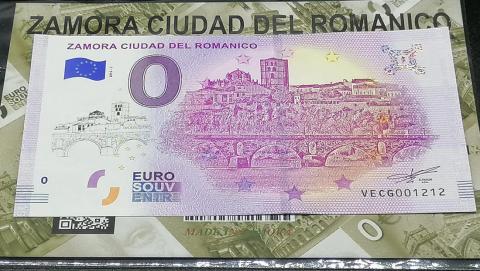 Billete Souvenir 0 Euro dedicado a Zamora, Ciudad del Románico sellado con un boceto de la ciudad, edición 2019-1. Fabricado en papel moneda y con las siguientes características de seguridad : marcas de agua, tiras de cobre, impresión en relieve (sensible al tacto), holograma, registro transparente, fondo de seguridad de la imprenta, tinta fluorescente visible bajo luz ultravioleta y un número de serie individual, único para cada billete y diferente al de la ilustración.