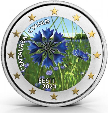 Moneda de 2 Euro Estonia 2024 dedicada a el Aciano, flor nacional de Estonia, procedente de cartucho en calidad S/C. Coloreada