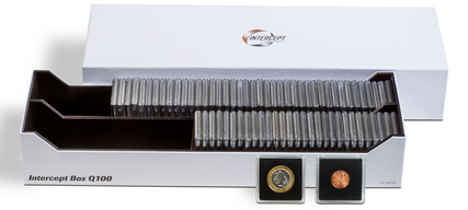 Con el interior forrado con el material INTERCEPT®, la caja protege sus monedas de forma activa contra la oxidación. Con capacidad para 100 cápsulas de monedas QUADRUM o para aproximadamente 300 cartones de monedas (50 x 50 mm). Aptas para monedas y medallas de cobre, oro, plata, latón, etc. Tamaño exterior: 370 x 125 x 64 mm.