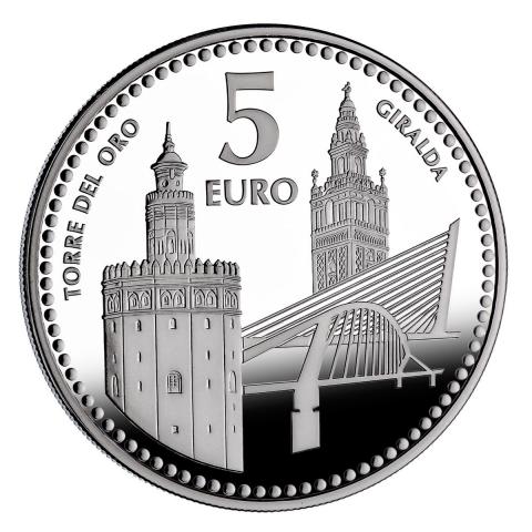 En el reverso se reproduce la Torre del Oro y la Giralda de Sevilla con las siluetas de los puentes de la Barqueta y del Alamillo.