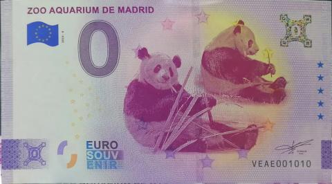 Billete Souvenir 0 Euro de la serie Zoo Aquarium de Madrid dedicado a los Pandas, edición 2024-8. Fabricado en papel moneda y con las siguientes características de seguridad : marcas de agua, tiras de cobre, impresión en relieve (sensible al tacto), holograma, registro transparente, fondo de seguridad de la imprenta, tinta fluorescente visible bajo luz ultravioleta y un número de serie individual, único para cada billete y diferente al de la ilustración.