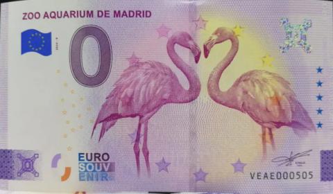 Billete Souvenir 0 Euro de la serie Zoo Aquarium de Madrid dedicado a los Flamencos, edición 2024-9. Fabricado en papel moneda y con las siguientes características de seguridad : marcas de agua, tiras de cobre, impresión en relieve (sensible al tacto), holograma, registro transparente, fondo de seguridad de la imprenta, tinta fluorescente visible bajo luz ultravioleta y un número de serie individual, único para cada billete y diferente al de la ilustración.