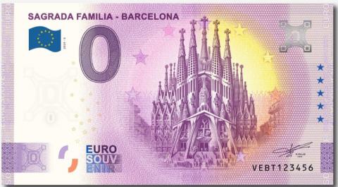 Billete Souvenir 0 Euro dedicado a la Sagrada Familia Barcelona, edición 2024-6. Fabricado en papel moneda y con las siguientes características de seguridad : marcas de agua, tiras de cobre, impresión en relieve (sensible al tacto), holograma, registro transparente, fondo de seguridad de la imprenta, tinta fluorescente visible bajo luz ultravioleta y un número de serie individual, único para cada billete y diferente al de la ilustración.