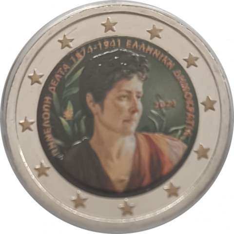 Moneda de 2 Euro Grecia 2024 conmemorativa de los 50 Años del nacimiento de Penélope Delta, procedente de cartucho en calidad S/C. Coloreada.