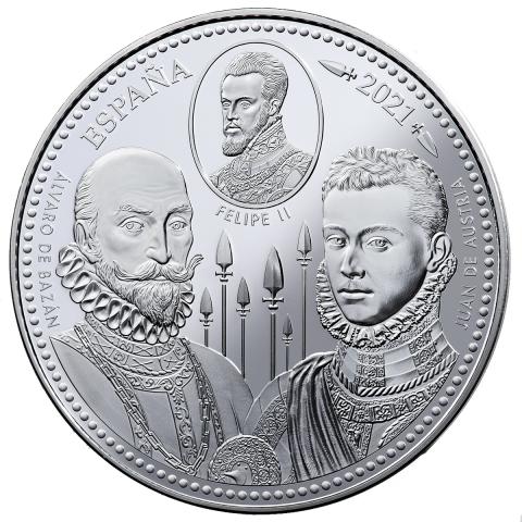 En el anverso de la moneda, en la parte superior, se reproduce un detalle de la cabeza del retrato de Felipe II, realizado por Tiziano, que se conserva en el Museo Nacional del Prado, de Madrid y en la parte izquierda se reproduce el retrato de Álvaro de Bazán y Guzmán, obra de Rafael Tegeo que se conserva en el Museo Naval, de Madrid. En la parte derecha se reproduce un retrato de don Juan de Austria, realizado por Alonso Sánchez Coello, que se conserva en el Monasterio de las Descalzas Reales, de Madrid.