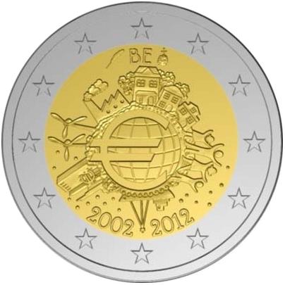 Moneda de 2 Euro Bélgica 2012 conmemorativa de los 10 Años de la circulación de Monedas y Billetes Euro sacada de cartucho en calidad SC.