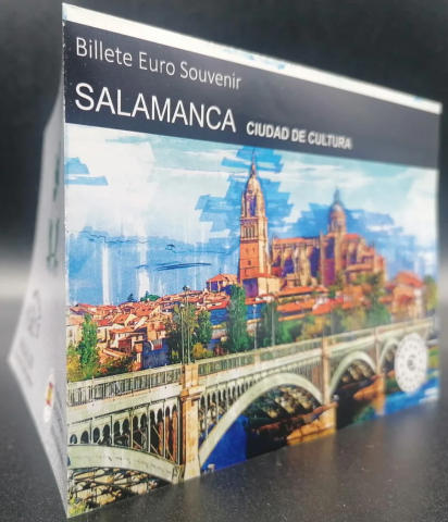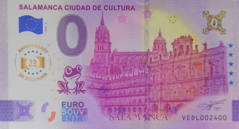 Billete Souvenir 0 Euro dedicado al aniversario de Salamanca ciudad de la Cultura, edición 2025-4. Fabricado en papel moneda y con las siguientes características de seguridad : marcas de agua, tiras de cobre, impresión en relieve (sensible al tacto), holograma, registro transparente, fondo de seguridad de la imprenta, tinta fluorescente visible bajo luz ultravioleta y un número de serie individual, único para cada billete y diferente al de la ilustración.