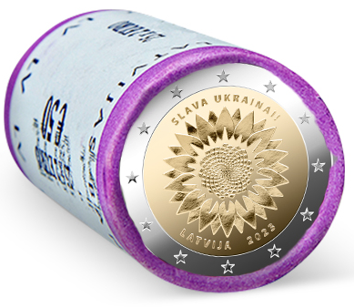 Cartucho de 25 monedas de 2 Euro Letonia 2023 dedicada al Girasol de Ucrania. En calidad S/C.