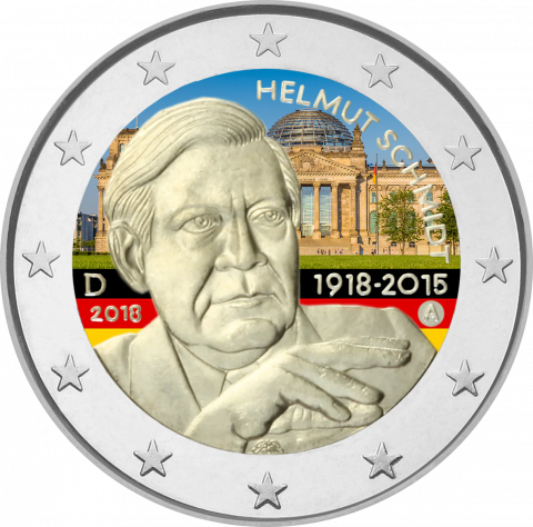Monedas de Alemana de 2 Euro 2018 conmemorativas Centenario del Nacimiento de Helmut Schmidt, canciller de la República Federal de Alemania desde 1974 hasta 1982, procedentes de cartucho en calidad SC. Coloreada.