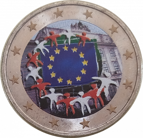 Moneda de Austria de 2 Euro 2015 conmemorativa de los 30 Años de la creación de la Bandera Europea. Coloreada.
