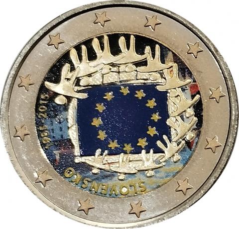 Moneda de 2 Euro Eslovaquia 2015 conmemorativa común para celebrar los 30 Años Bandera Europea, procedente de cartucho en calidad S/C. Coloreada.