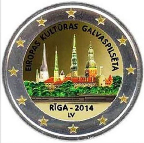 Moneda letona de 2 Euro conmemorativa de la Ciudad de Riga, Capital Europea de la Cultura 2014. Procedente de cartucho en calidad S/C. Coloreada
