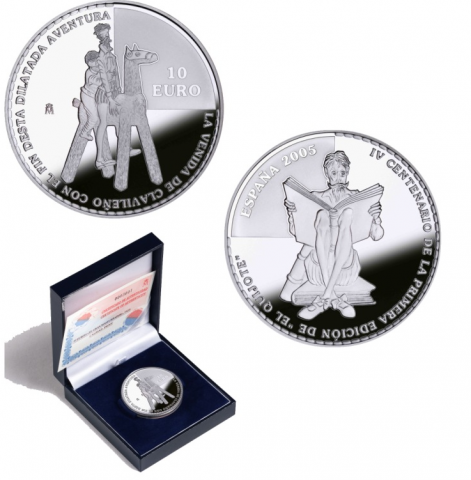 Moneda de 10 Euro España 2005 acuñada en plata 925 milésimas que conmemora el IV Centenario de la primera edición de «El Ingenioso Hidalgo Don Quijote de la Mancha », de Miguel de Cervantes, la novela más reconocida de la literatura universal. En calidad PROOF
