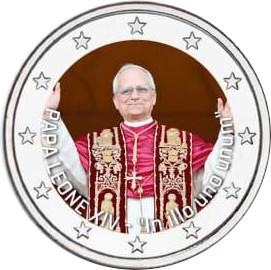 Moneda de 2 Euro pintadas dedicadas al Papa León XIV con la leyenda PAPA LEONE XIV "In Illo uno unum", no se aprecia sobre que monedas están estampadas.