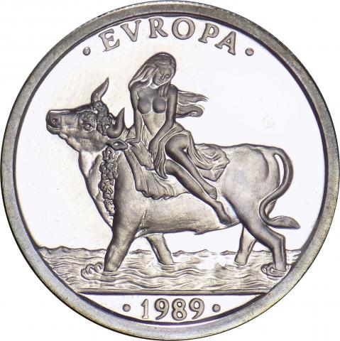 Moneda de España de 1 ECU 1989 al rapto de Europa, acuñada en plata en calidad Flor de cuño.