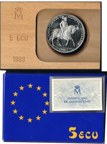 Moneda de España de 5 ECU FNMT 1990 dedicada a Alfonso X de Castilla, acuñada en plata en calidad Flor de cuño.