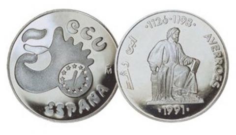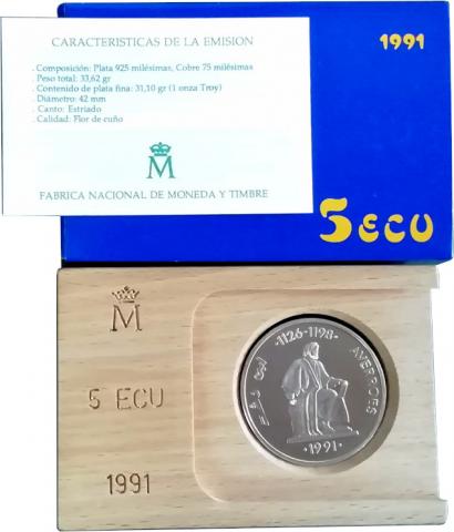 Moneda de 5 ECU España FNMT 1991 dedicada a Averroes, en calidad Flor de cuño.