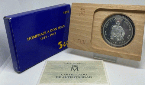 Moneda de España de 5 ECU FNMT 1993 como homenaje a Don Juan 1913-1993, acuñada en plata en calidad Flor de cuño.