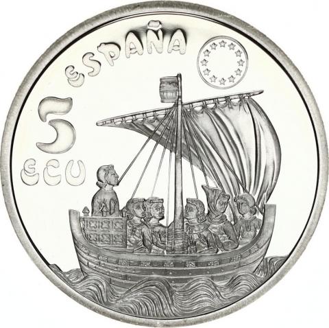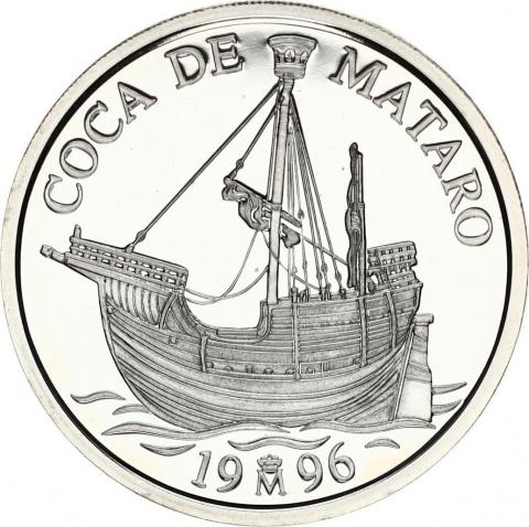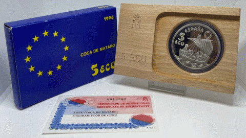 Moneda de España de 5 ECU FNMT 1996 dedicada a la Coca de Mataro, acuñada en plata en calidad Flor de cuño.