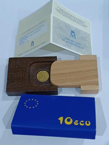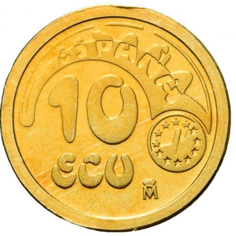 Moneda de España de 10 ECU FNMT 1989 con las columnas de Hércules - PLUS ULTRA, acuñada en oro en calidad Flor de cuño.