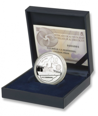 Realizada en calidad proof y acuñada en plata, la moneda de colección del Año Polar Internacional muestra en su anverso la efigie de S. M. el Rey Don Juan Carlos I, y en su reverso la imagen del Buque de Investigación Oceanográfica Hespérides, con la silueta de la Antártida de fondo.