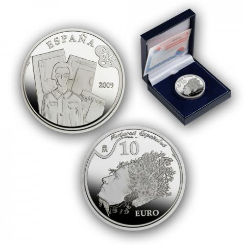En el reverso de esta primera pieza de 8 reales y 10 euros de valor facial se reproduce la obra "Busto de mujer retrospectivo" (1933).