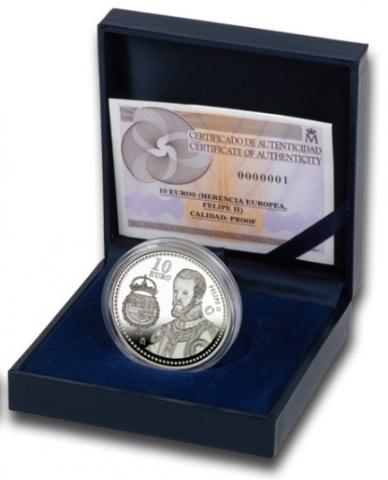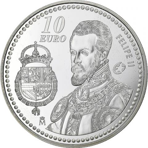 En el reverso se reproduce el busto del Rey Felipe II, tomado del retrato realizado por Tiziano. A la izquierda, aparece el escudo de armas, que preside la entrada al Patio de los Reyes del Real Monasterio de San Lorenzo del Escorial.