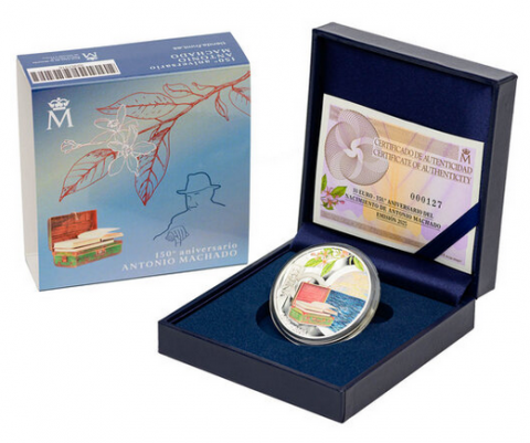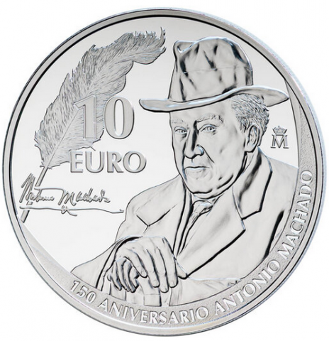 Con motivo del 150º aniversario del nacimiento de Antonio Machado, la Fábrica Nacional de Moneda y Timbre-Real Casa de la Moneda dedica una moneda de colección a este poeta y dramaturgo, perteneciente a la denominada Generación del 98.