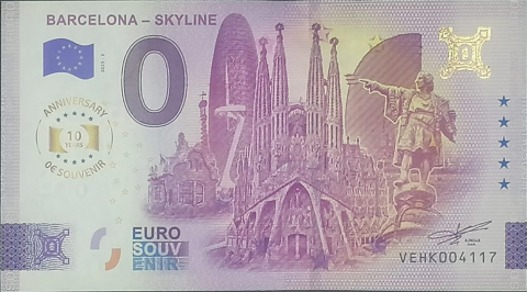 Billete Souvenir 0 Euro dedicado al skyline de Barcelona, edición 2025-2 aniversario. Fabricado en papel moneda y con las siguientes características de seguridad : marcas de agua, tiras de cobre, impresión en relieve (sensible al tacto), holograma, registro transparente, fondo de seguridad de la imprenta, tinta fluorescente visible bajo luz ultravioleta y un número de serie individual, único para cada billete y diferente al de la ilustración.