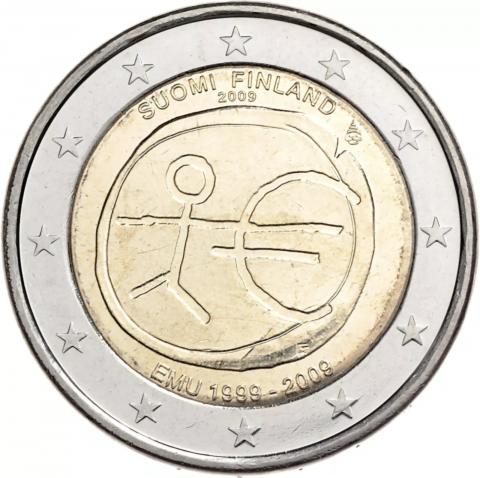Cápsula con la moneda de 2 Euro Finlandia 2009 conmemorativa 10 Años del Nacimiento del Euro EMU en calidad PROOF, con la variante del canto "SUOMI FINLAND".