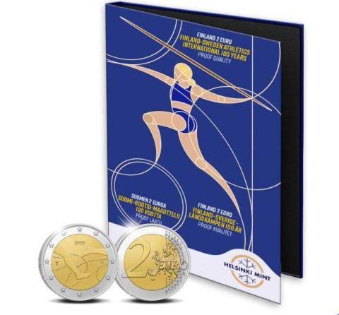 Estuche de lujo oficial con la moneda de 2 Euro Finlandia 2025 dedicados al 100º aniversario de los Juegos de Atletismo Finlandia-Suecia, en calidad PROOF.